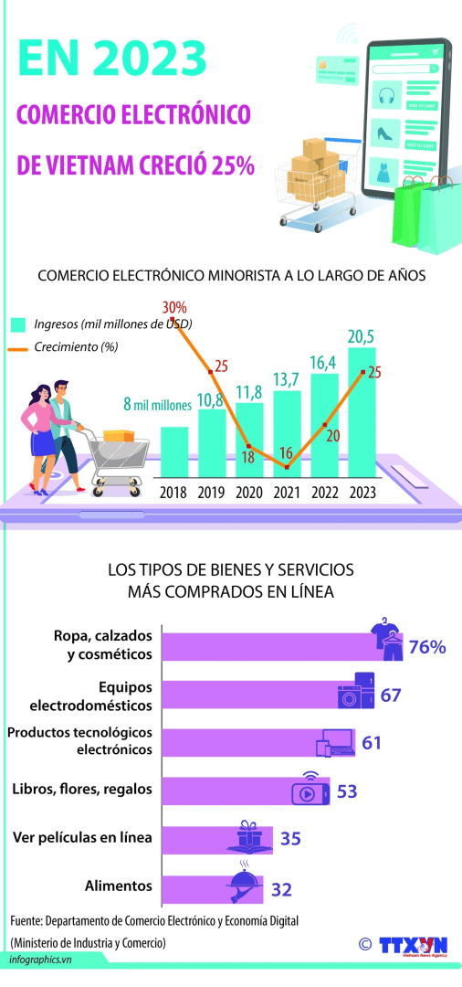 Según el informe sobre los residuos de envases de plástico del comercio electrónico en Vietnam en 2023 elaborado por el grupo de autores de la Asociación de Comercio Electrónico de Vietnam (VECOM), el mercado minorista en línea de bienes en 2023 se estimó en unos 17,3 mil millones de dólares, con un número total de paquetes de mercancías valoradas en 1,84 mil millones de dólares y los pedidos de alimentos a través de las aplicaciones en 1,4 mil millones de dólares. El comercio electrónico en Vietnam utiliza 332 mil toneladas de envases, de las cuales el volumen de los de plástico de todo tipo fue de 171 mil toneladas el año pasado. Se estima que los residuos plásticos de este tipo de negocio podrían alcanzar 800 mil toneladas para 2023.