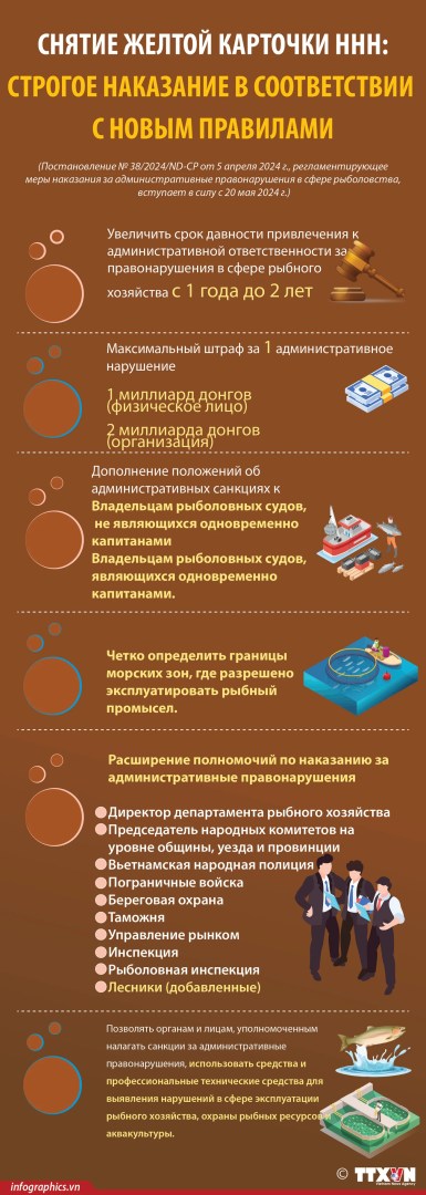В октябре 2024 года Европейская комиссия продолжит свою пятую инспекцию во Вьетнаме в рамках выполнения рекомендаций по борьбе с ННН-промыслом. Это решающая инспекция, направленная на снятие «желтой карточки» с вьетнамских морепродуктов. Поэтому, наряду с прибрежными населенными пунктами по всей стране, 3 южные прибрежные провинции дельты Красной реки продолжают прилагать все усилия контроля над рыболовной деятельностью, что способствует решимости страны вернуть себе «зеленую карточку» ННН-промысла./.
