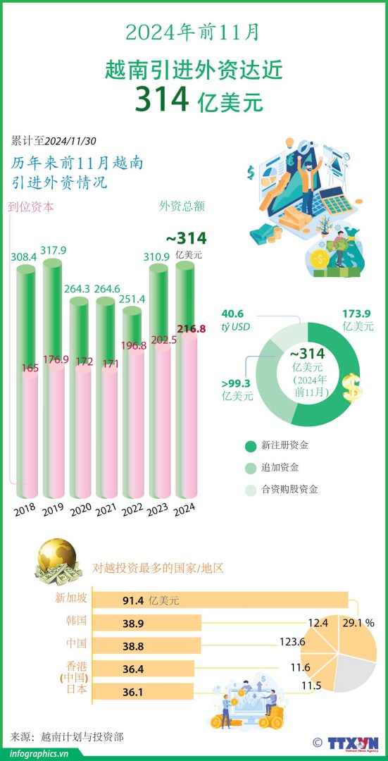据计划与投资部,截至2024年11月30日,越南引进外资达近314亿美元,包括新注册资金、追加资金、合资购买股权和收购外国投资者的股权等资金,同比增长1%。外资项目实际利用资金约216.8亿美元,同比增长7.1%。