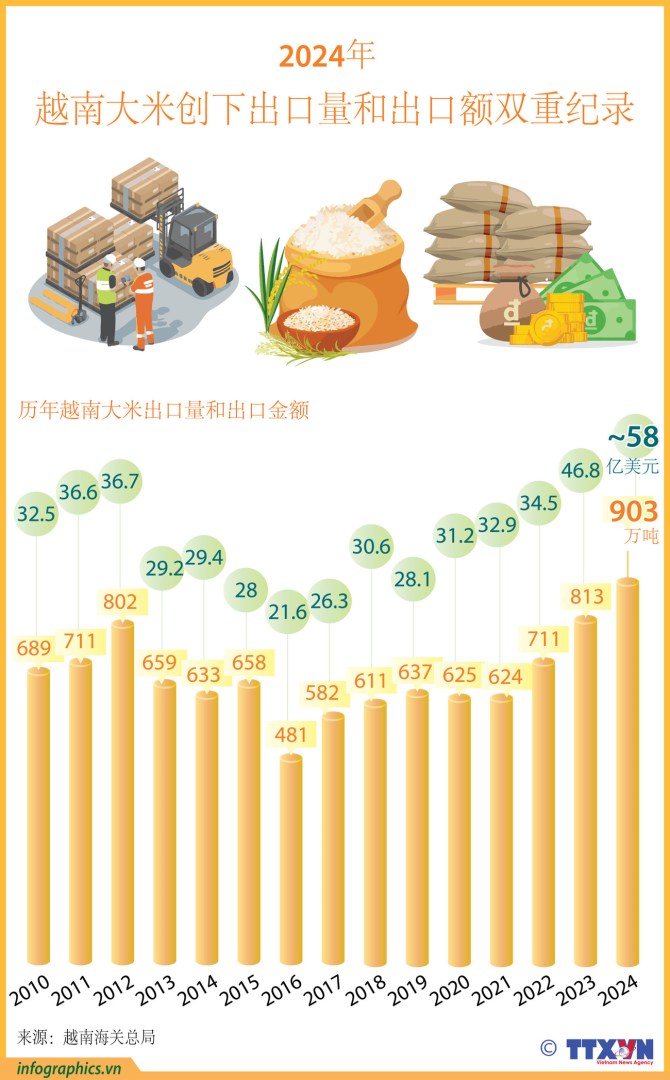 2024年大米出口量和出口额均创下新纪录,使越南继续保持世界大米出口国前三的地位。预期,2025年世界大米供应源和需求将出现许多新变化,越南大米出口将面临许多机遇与挑战。