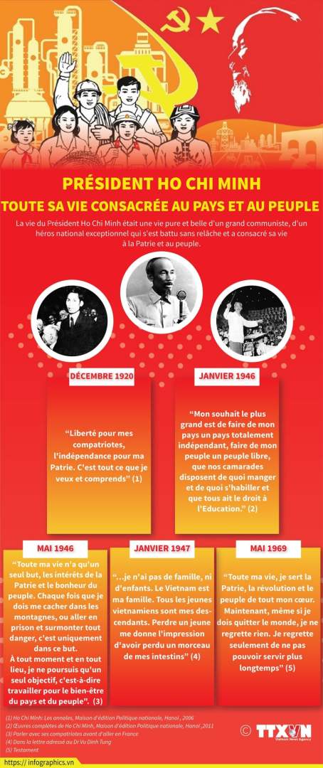 “Mon ultime souhait est que tout notre Parti, tout notre peuple, étroitement unis dans le combat, édifient un Vietnam pacifique, unifié, indépendant, démocratique et prospère, et apportent une digne contribution à la révolution mondiale”.