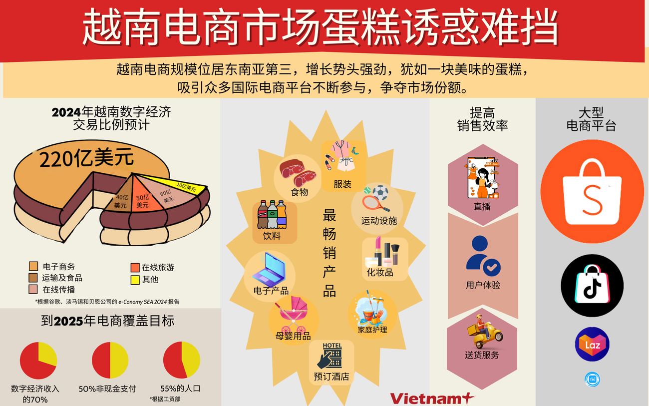据专家评估,2024年越南电商市场规模已突破250亿美元,同比增长20%,占全国社会零售品和服务零售总额的9%。特别值得注意的是,越南继续位列全球电商发展领先的十大国家之列,并在发展速度方面排名全球第五。