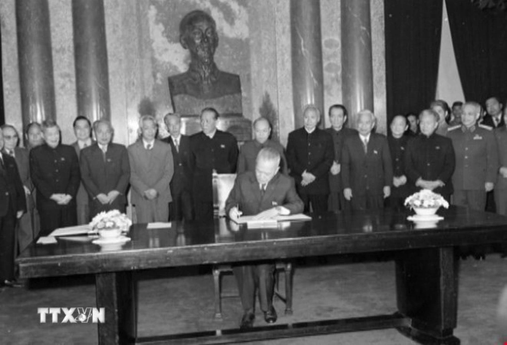 Г-н Нгуен Хыу Тхо, исполняющий обязанности президента Социалистической Республики Вьетнам, подписал указ о провозглашении новой Конституции утром 19 декабря 1980 года. (Фото: ВИА) Конституция 1992 года