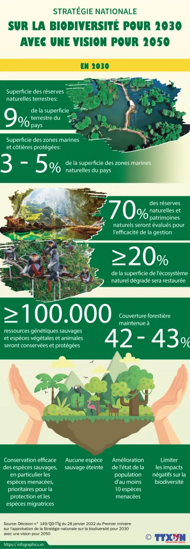 Pour concrétiser la Stratégie nationale sur la biodiversité à l’horizon 2030, avec une vision à 2050, le Vietnam s’est fixé des objectifs ambitieux : étendre les aires protégées à au moins 9 % de la superficie terrestre et 5 % de la zone maritime, restaurer au moins 20 % des écosystèmes dégradés, empêcher toute extinction d’espèce sauvage causée par l’activité humaine, et préserver et conserver au minimum 100 000 ressources génétiques animales et végétales.