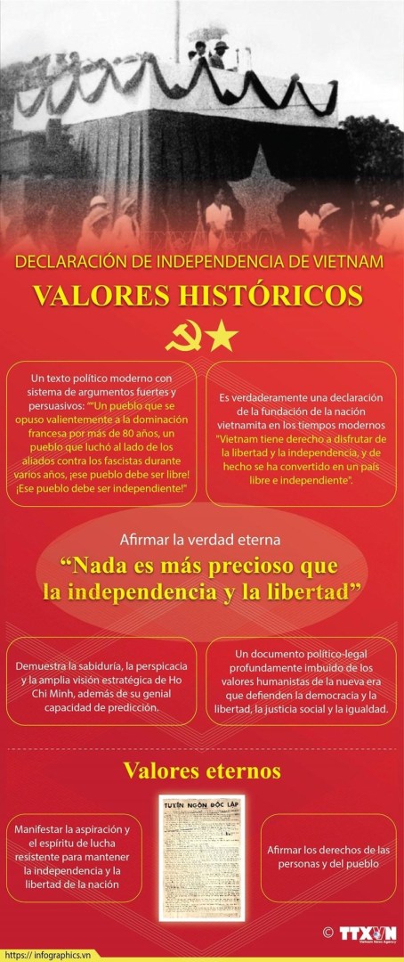 El 2 de septiembre de 1945, ante millones de compatriotas vietnamitas y todo el mundo, el Presidente Ho Chi Minh leyó solemnemente la Declaración de Independencia que proclamaba el nacimiento de la República Democrática de Vietnam. Este breve y conciso texto de fundación no solo anunciaba al mundo el nacimiento de un país independiente y soberano, sino que también era una declaración sobre los derechos humanos de Vietnam.